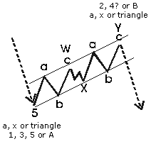 In onze Automatische analysemachine gebruiken we de WXY en WXYXZ ook voor Dubbele en Driedubbele Zigzags. Dit is een meer consistente manier van labelen van deze patronen, omdat nu de ABC golven in golven W en Y sub-golven zijn en een niet passende Golf X wordt uitgesloten.