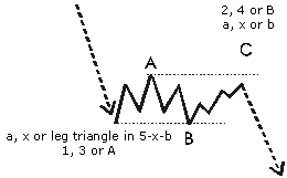 In plaats van een doorlopende correctie zou dit in theorie een extensie in een impulsgolf kunnen zijn, waar de golf is onderverdeeld in twee (of meer) 1,2 combinaties. Als de B een duidelijke drie golf is, dan is het een Running Flat, anders een extensie. In de praktijk zal er geen verschil zijn in de marktrichting: in beide scenario´s zal de markt uitbreken in de richting van de B golf, daarom kiest ELWAVE ervoor een extensie te labelen. Voor de volledigheid hebben we dit patroon opgenomen, het is geïmplementeerd in de CLASSIC RULES, niet in de MODERN RULES.