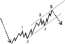 Golf 3 is meestal de krachtigste golf en laat een grote acceleratie zien in relatie tot golf 1 en 5. Als golf 3 inderdaad een bijna verticale stijging of daling laat zien, teken dan een trendlijn die golf 2 en 4 met elkaar verbindt en een parallelle lijn vanaf golf 1(!). Deze parallelle lijn zal golf 3 doorsnijden en het koersdoel van golf 5 aangeven. De ervaring leert dat dit een zeer waardevol trendkanaal is.
