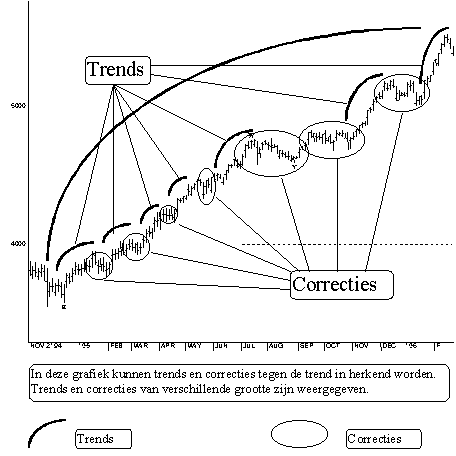 De volgende voorbeelden laten het verschil zien tussen een trend (impuls golf)en een correctie (zijwaartse koersbeweging met overlappende golven). Het laat ook zien dat grotere trends bestaan uit (een heleboel) kleinere trends en correcties, maar het ziet er altijd hetzelfde uit.